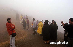 中國(guó)吉林長(zhǎng)白山天池怪獸被之迷被傳媒稱為“世界四大未解之謎”(水怪之謎、野人之謎、百慕大三角之謎、飛碟之謎)之一。二○○四年七月中旬,成百上千的國(guó)內(nèi)外游客,冒著雨水和大霧登上海拔二千多米的天池火山口,期盼清日之中目睹長(zhǎng)白山天池的真容和怪獸的蹤跡。天池是火山噴發(fā)自然形成的火山口湖,是中朝兩國(guó)的界湖。因?yàn)樗幍奈恢酶?水面海拔2194米),所以稱為“天池”。中新社記者:鄒憲