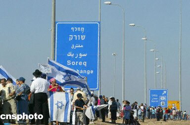 中新網7月26日電 據法新社報道,以色列10萬名示威者以手拉手的方式,在加沙北部組成90公里人鏈,抗議沙龍政府的單邊行動計劃。