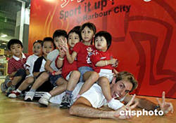 在8月世界體壇盛事,全城矚目之際,香港海港城特別聯(lián)同F(xiàn)itness First健身會所,向顧客提供多項在海港城SportX舉行的午間及晚間團體跳舞課程,讓顧客有機會親身參與,強身健體活動。圖為9日教練現(xiàn)場與小朋友玩游戲。作者:洪少葵