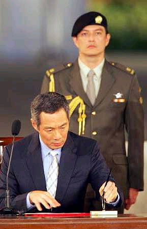李顯龍總理在宣誓書上簽字,新加坡總統(tǒng)納丹也在宣誓書上簽字。接著,納丹總統(tǒng)把委任狀交給新任總理李顯龍,正式宣布李顯龍出任新加坡第三任總理。李總理的夫人何晶和子女也出席了當晚的就職典禮。