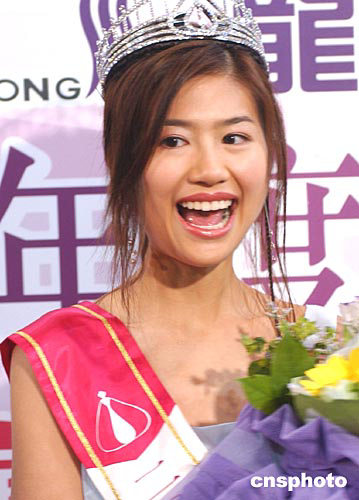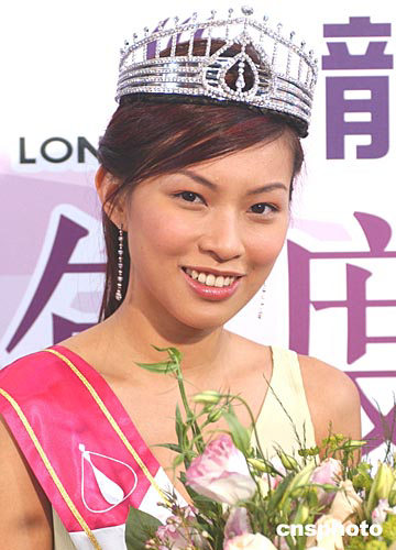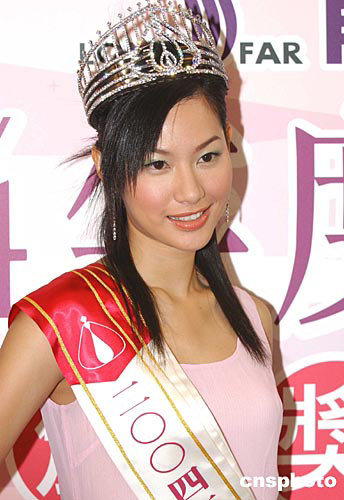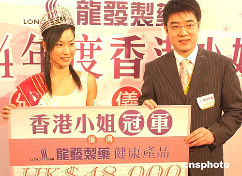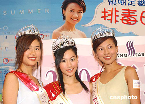 2004年度香港小姐冠軍徐子珊﹑亞軍朱慧敏﹑季軍符思思16日在會展中心出席香港龍發制藥集團頒獎儀式。中新社記者:趙振清