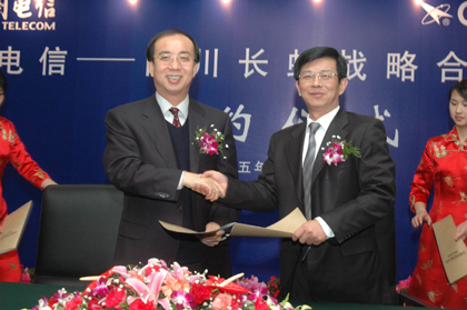 中新網1月11日電 (陳紅)中國電信集團和四川長虹集團戰略合作備忘錄簽字儀式昨天在北京舉行。中國電信集團公司副總經理冷榮泉和四川長虹董事長趙勇代表雙方簽署了《中國電信——四川長虹戰略合作備忘錄》。信息產業部副部長婁勤儉、四川省副省長楊志文、中國電信集團公司總經理王曉初等也出席了簽字儀式。中國電信和四川長虹將在終端設備及渠道領域結成戰略合作伙伴,此次通信和家電巨頭強強聯手,標志著中國3C融合從概念形成到產業推進邁出實質性的一步,同時也將有力地推動雙方戰略轉型工作的深入開展。