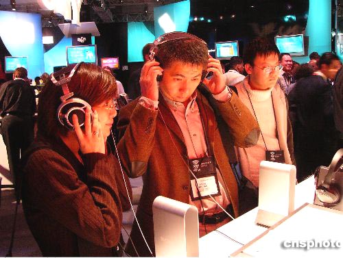 一月六日在美國拉斯維加斯開幕的二00五國際消費電子展,吸引世界各地的商家及消費者。圖為來自中國大陸的參觀者在索尼展臺前試聽音響。作者:潘旭臨