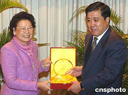 外交部駐港特派員楊文昌(右)2月3日在香港外交部駐港公署接受全國政協常委﹑中國光彩事業促進會副會長張永珍博士向外交部扶貧辦公室捐款40萬元港幣﹐在捐贈儀式上楊文昌特派員向張永珍博士贈送紀念品。