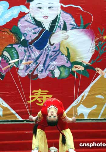 歡度新春佳節之際,北京眾多廟會各種精彩的文化活動吸引市民游客觀賞,二月十日在東岳廟春節文化廟會上,雜技團小演員表演的“彩蝶紛飛”吸引游人觀看。作者:錢興強