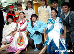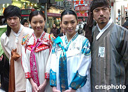 香港演員張文慈等身著韓國服飾20日亮相香港旺角鬧市區﹐為韓劇《茶母》宣傳造勢。作者:趙振清