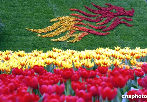 正在香港維港舉行的“香港花卉展覽”上,大型花卉“郁金香”在香港標(biāo)志飛龍的襯托下鮮艷耀目。作者:洪少葵