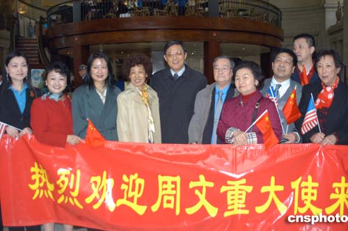 中國新任駐美大使周文重當地時間四月三日中午抵達美國首都華盛頓履新,受到當地華人僑學界代表的熱烈歡迎。