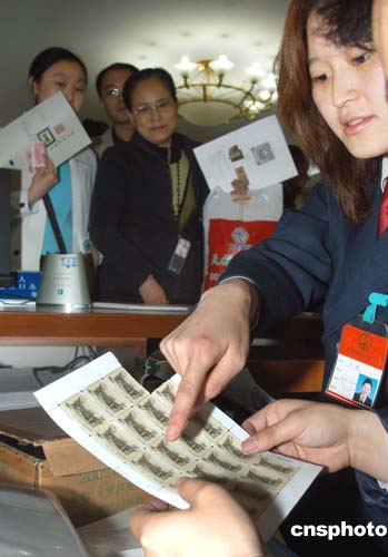 四月五日,新中國第一套地方版印花稅票《北京印花稅票之一北京胡同》在北京市各區縣地稅局向社會發售。此套印花稅票有九種面值,由北京市地方稅務局發行、國家郵政局郵票印制局印制,極具收藏價值。圖為北京市東城區地稅局工作人員展示新舊兩版印花稅票,圖右為新版印花稅票。作者:張宇