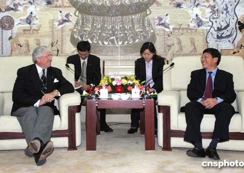 二零零五年四月六日,中國國家體育總局副局長段世杰(右)在北京會見了加拿大奧委會首席執行官克里斯·盧杰(左)一行,并出席中加兩國奧委會簽署的諒解備忘錄。作者:武仲林