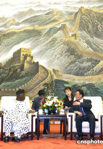 中新社北京四月十五日電(記者孫宇挺)全國人大常委會委員長吳邦國今天在人民大會堂會見了尼日利亞總統、非盟輪值主席奧巴桑喬。