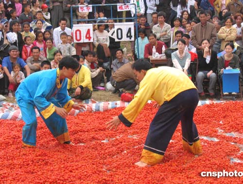 四月十六日,在廣西百色市第二屆布洛陀民俗文化旅游節(jié)上,該市田陽縣的壯族男子在西紅柿堆上進行摔交比賽。