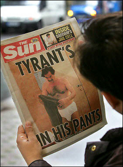 當天《太陽報》刊登的這組照片題為“薩達姆的監獄生活,先睹為快“。在頭版的一張照片中,薩達姆上身赤裸,只穿著白色內褲,手里拿著衣服,身后是一扇沒有上漆的木門。