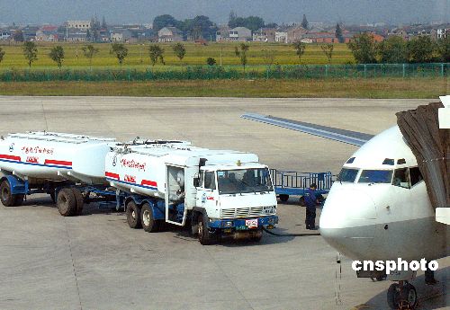| 2005年6月3日,據民航總局披露,中國三大航空公司——國航、東航、南航提出的在機票中增加燃油附加費的申請被有關部門正式駁回。上月中旬,國航、東航、南航三大航空巨頭共同向國家發改委申請了征收約占機票價格10%的燃油附加費。民航總局有關負責人表示,盡管目前燃油價格居高不下,但由于2004年4月份《民航國內航空運輸價格改革方案》中已經明文取消了燃油附加費,因此三大航空公司的申請不被接受。圖為寧波櫟社機場一輛加油車正在為飛機加油。作者:張和平