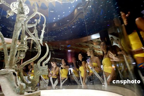 六月十五日,二○○五國際旅游小姐冠軍總決賽的來自七十五個國家和地區的旅游形象大使,來到四川省廣漢市,參加二○○五中國四川三星堆國際旅游文化節暨二○○五國際旅游小姐最具魅力小姐冠軍大賽決賽,各國旅游小姐在參觀三星堆博物館時,被古蜀文明深深吸引。圖為各國佳麗在三星堆博物館館藏文物“神樹”前流連忘返。作者:盛佳鵬