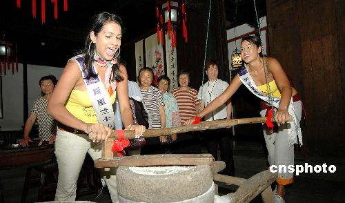 六月二十日,參加二○○五國際旅游小姐世界最佳民族服裝冠軍大賽的選手們在周莊進行采風活動,選手們在水鄉古鎮周莊游覽了雙橋、貞豐文化街的酒作坊、竹草編坊、聚賓樓等。圖為傳統的石磨吸引了參賽選手。作者:蔣振江