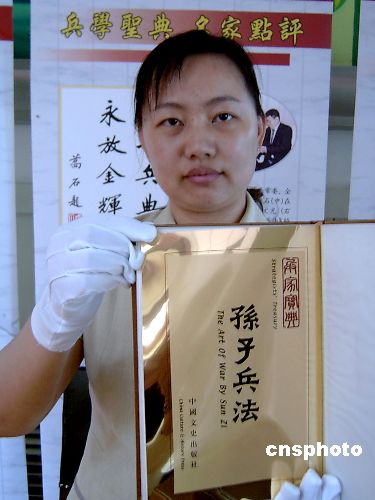 6月22日,發行人員在展示黃金版中英文《孫子兵法》。6月21日,該書在齊齊哈爾市博物館首發,限量發行36套。黃金版《孫子兵法》為仿古籍16開本,40頁金紙,每套定價19600元。作者:王云龍