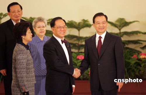 八時五十八分許,身著深色西裝、深紅色領結的香港特別行政區行政長官曾蔭權攜夫人步入香港廳。同樣著深色西裝、系深紅色領帶的國務院總理溫家寶與他緊緊握手。