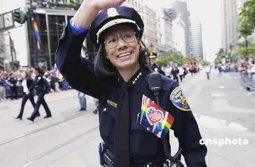 美國舊金山六月二十六日舉行第三十五屆同性戀大游行時,舊金山市華裔警察局長方宇文女士興致勃勃走在大街上維護秩序。作者:陳鋼