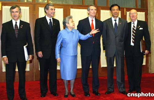中國國務院副總理吳儀(左三)、中國商務部部長薄熙來(右二)與美國商務部長古鐵雷斯(左二)、美國貿易代表波特曼(右三)、美國農業部長約翰斯(左一)、美國駐華大使雷德(右一)在會前合影。作者:廖文靜
