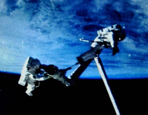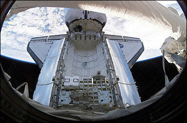 史蒂芬·羅賓遜在空間站機械臂協(xié)助下到達發(fā)現(xiàn)號前腹部,作了約五十分鐘的“太空手術(shù)”,順利清除隔熱瓷片縫隙凸起的填充材料。