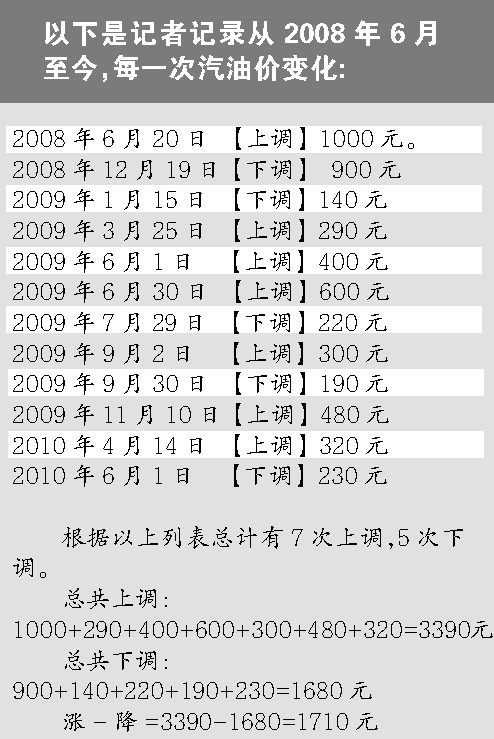 在帖子里,網友列出了從2008年6月至2010年6月,每一次國家發(fā)改委對油價的調整,得出結論是漲7次,降4次,每噸汽油的漲幅總額為3390元,而每噸汽油的降幅總額為760元,于是得出計算結論:2年前的油價是74美元,現(xiàn)在還是74美元,可是汽油價卻漲了2630元1噸。