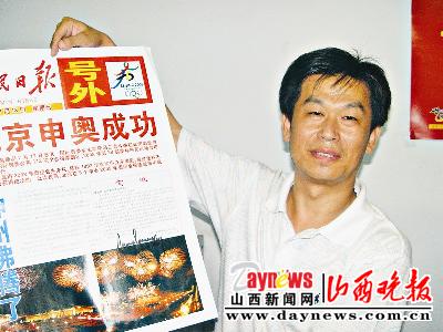 昨日,運城收藏愛好者陳國慶的奧運系列收藏又添珍品:原國際奧委會主席薩馬蘭奇在他寄去的報道奧運申辦成功的《人民日報》號外簽名,并給陳國慶親筆回信!白蛉障挛纾沂盏剿_馬蘭奇的信件后,別提有多高興了!苯袢赵绯,記者見到陳國慶時,他仍沉浸在喜悅中。今年39歲的陳國慶是中保財險運城分公司的員工,十多年前迷上了收藏,尤其對報紙創刊號和號外情有獨鐘。