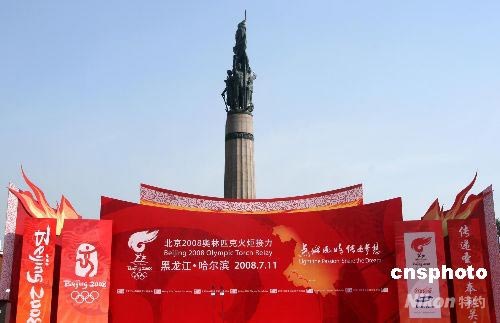 7月11日,北京奧運火炬在哈爾濱傳遞,從防洪紀念塔前起跑。1957年,松花江洪水威脅哈爾濱,全市人民眾志成城戰勝洪水襲擊,并于次年建立此塔以志紀念。 中新社發 周兆軍 攝