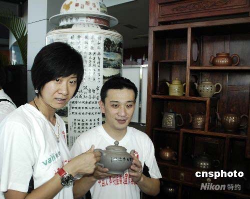 7月12日,“2008奧林匹克文化中國行”在海南三亞開幕。作為全國巡展的首站,三亞的展覽活動歷時兩天,公開展示由226名書畫家共同創作的奧運主題大型書畫作品《神州圣火傳遞圖》和《神州圣火傳遞頌》。作品全面描繪了113個火炬傳遞城市的風土人情;顒悠陂g還展出奧運文化優秀作品“中華紫砂壺”和“盛世將軍瓶”。圖為1996年亞特蘭大奧運會游泳冠軍樂靜宜(左)和2000年悉尼奧運會跳水冠軍肖海亮(右),在“中華紫砂壺”和“盛世將軍瓶”前展示“中華紫砂壺”。中新社發 尹海明 攝