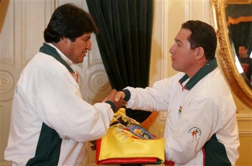 玻利維亞總統莫拉萊斯7月28日在?偨y府為即將出征北京奧運會的玻體育代表團舉行出征儀式并授旗。