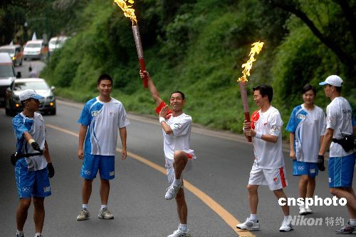 8月4日,奧運火炬在樂山峨眉山下傳遞,火炬手做起武俠造型傳遞火炬。中新社發 廖攀 攝