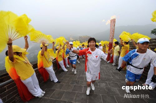 8月7日上午,奧運火炬在北京八達嶺長城傳遞。圖為第10棒火炬手祁艷霞傳遞火炬。 中新社發 廖攀 攝