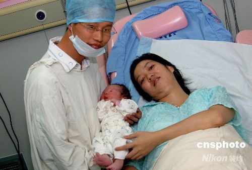 8月8日清晨5點30分,福州市民范敬琴在福建省第二人民醫(yī)院婦產科手術室順利產下一名奧運男寶寶。這名奧運男寶寶體重3.8公斤,母子平安。圖為黃義華、范敬琴夫婦與喜降人間的奧運寶寶合影。當天,第29屆夏季奧運會將在北京開幕。 中新社發(fā) 劉可耕 攝