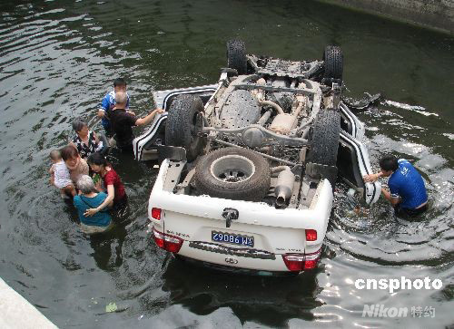 8月8日下午,北京萬泉河路發(fā)生一起交通事故,一輛載有一家六口的吉普車翻進(jìn)水位齊腰的河溝里。事發(fā)地點(diǎn)不遠(yuǎn)的奧運(yùn)志愿者們在第一時間及時沖到河中進(jìn)行救援。發(fā)生車禍的一家六口人,包括老人、嬰兒在內(nèi),在幾位奧運(yùn)志愿者的解救下安然脫險。中新社發(fā) 吳佳佳 唐曼笛 攝