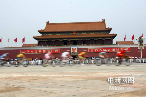 8月9日,2008北京奧運會自行車男子公路賽在永定門到居庸關248公里的賽道上舉行。圖為選手經過天安門廣場。 中新社記者 武仲林 攝
