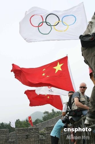 圖為奧運旗幟在長城上高高飄揚。中新社發 武仲林 攝