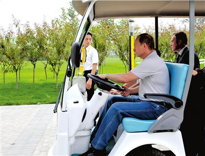 9日,普京駕電瓶車(chē)參觀北京奧運(yùn)村。