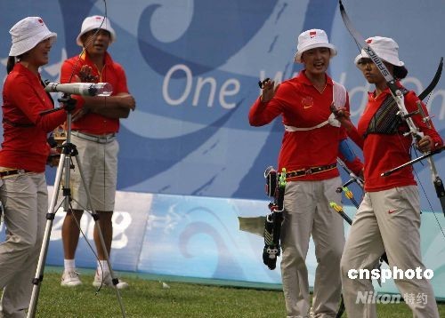 8月10日下午,由張娟娟、陳玲、郭丹組成的中國女子射箭隊在女子團體比賽半決賽中戰勝英國隊,將向多年來位居世界霸主地位的韓國隊發起挑戰。中新社發 任晨鳴 攝