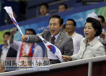 國際先驅導報特約撰稿張俊 實習記者聶東白發自北京 手持韓國國旗,隨拉拉隊的節奏不停揮舞。觀看完奧運開幕式的第二天,韓國總統李明博攜夫人悄然出現在北京奧體中心手球賽場,并安靜地走到主席臺最左邊座位坐下。韓國女子手球因為有總統助陣,最終以29平追平強悍的俄羅斯隊。