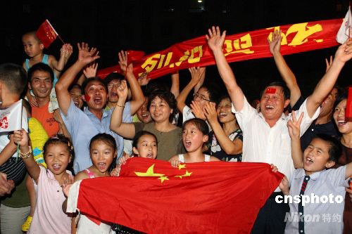 8月19日,江蘇常州市,陸春龍的父親陸建平(右三,臉上有國旗者)、母親倪如英(右六)和所住小區(qū)里的居民為陸春龍贏得北京奧運會男子蹦床金牌歡呼。中新社發(fā) 胡平 攝