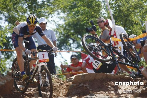 8月23日,北京奧運會自行車山地分項女子越野賽在北京老山山地自行車場舉行,不少參賽選手在陡峭的賽道上翻車。中新社發 盛佳鵬 攝