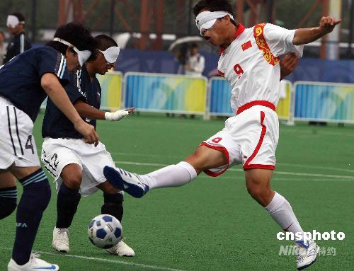 9月9日下午,北京殘奧會五人制(男子)足球小組賽在北京奧林匹克公園內的曲棍球場繼續舉行,中國隊以1比0擊敗實力強大的阿根廷隊。殘奧會五人制(男子)足球賽的參賽隊由四名盲人球員與一名非盲人守門員組成,盲人球員全憑刻苦的訓練與對足球的感覺在場上尋找攻破對方大門的機會。中新社發 任晨鳴 攝