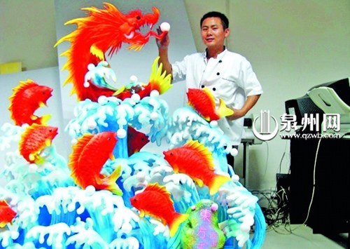 “飛天迎賓”、“鯉魚化龍”“東方醒獅”、“渡海觀音”等我(泉州)市各縣(市、區)一些群眾熟悉的城市標志,它們多為石頭、瓷、銅器等硬物雕刻而成。然而,在石獅某酒店中,“80后”的食雕師朱愛明,則用各種食品或泡沫雕成這些標志,成為宴席上的亮點。