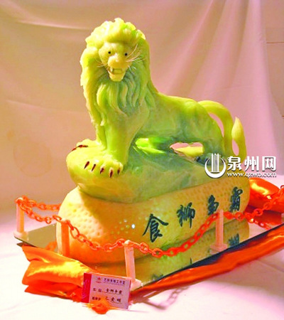 據朱愛明介紹,在作出雕刻城市標志決定后,他便找機會對每個市標進行實地觀察并拍照,然后取材。“因為造型、圖案等的不同,不同的市標必須用不同的食品來表現”,他說,比如石獅的市標,獅子頭尾高低位置相差較大,這就要求材質必須是實心的,而且要雕出70cm高的作品,顯然很難從天然的瓜果蔬菜中找到,于是,他就選擇了石花膏。