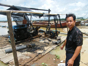 昨天上午11時許,記者與梁先生一同到現場了解情況。梁先生的金江沙場位于定安定城鎮和?谛缕骆偨唤缣,已經暫停作業,工人們在工棚休息。記者在采沙船被毀現場看到,采沙船擱淺在岸邊,采沙機器完全被毀,電池燒焦,木板千瘡百孔,表面被大火熏得烏黑,內部零件完全破壞。雖然距離案發已有10余天,當時大火熊熊燃燒的情景依然可以想見。