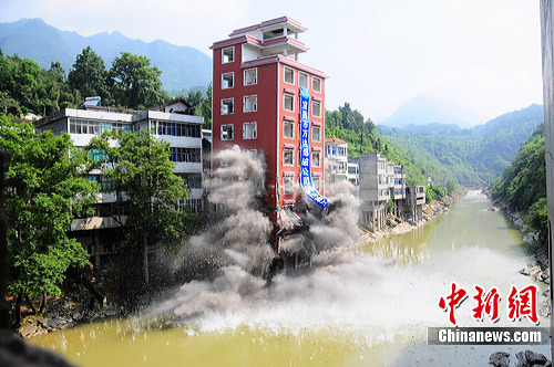 爆破既不能損壞連體的4層樓房,又不能長時間堵塞河道,倒塌距離必須嚴格控制在20米以內,技術要求高。工程施工方采取定向爆破和原地爆破兩種方式同時進行,安裝了60公斤炸藥對房屋實施爆破拆除,此次爆破非常成功,被網友稱為“最!钡暮又羞`章建筑終于強拆。