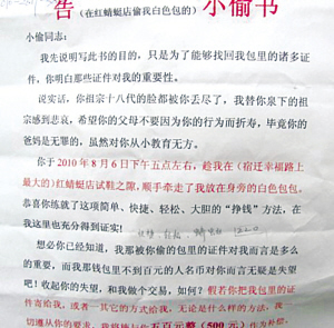 小陳在《告小偷書》中寫到:“假若你把我包里的證件寄給我,或者以其他的方式給我,無論是什么樣的方法,我一切遵從你的要求,我將施與你500元作為補償。因為我是名學生,無更多的經濟能力!衷心希望與你私下和解此事!”
