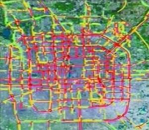 昨日晚高峰城區路況圖(紅色為擁堵路段)。視頻截圖