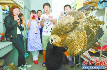 美術學院的女生小劉告訴記者,28日傍晚6時許,她第一個回到宿舍,剛進門陽臺外突然飛進來一只大鳥,沖著她的臉撲來,嚇得她抱頭尖叫,趕緊沖出了宿舍,“我仔細一看才發現是一只老鷹,我很害怕,就叫男生來幫忙了。”