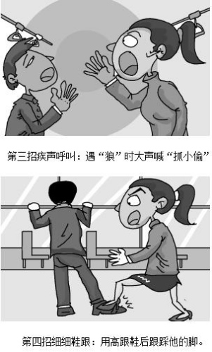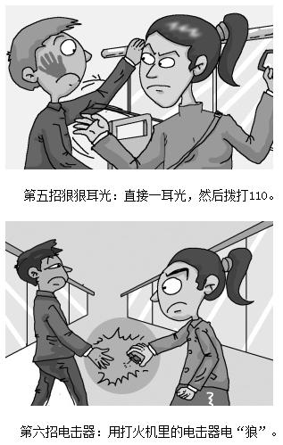 《公交防狼全手冊》發(fā)出后,引起了眾多女性關(guān)注,幾個(gè)小時(shí)之內(nèi)就有數(shù)以萬計(jì)的網(wǎng)民點(diǎn)擊,其中防狼六招也成為女性之間互轉(zhuǎn)的信息。這六招分別是:第一招冷冷目光,是用威懾力眼神與“狼”對視;第二招尋找依靠,即向司機(jī)或者售票員靠近;第三招疾聲呼叫,就是遇“狼”時(shí)大聲喊“抓小偷”;第四招細(xì)細(xì)鞋跟,就是用高跟鞋后跟踩他的腳;第五招狠狠耳光,就是直接打耳光,然后報(bào)警;對于第六招就更有意思了,就是用一次性打火機(jī)里的電擊器電“狼”,產(chǎn)生瞬間電壓足以讓“狼”手彈回去,而且不產(chǎn)生直接傷害。